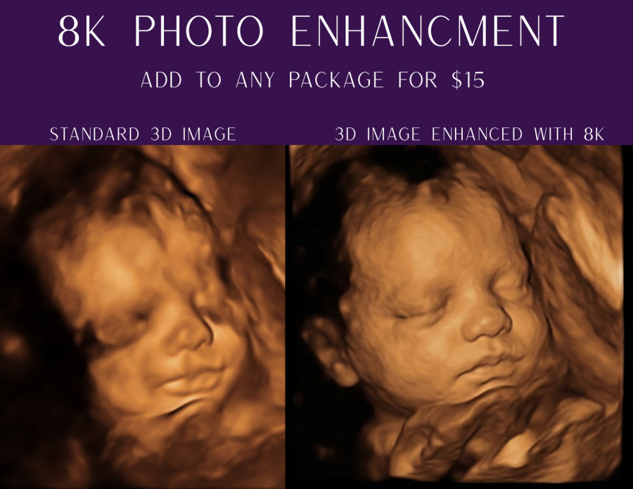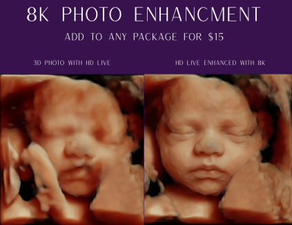 Add on a digital 8k photo enhancement of one of your ultrasound photos for just $15 per image. You will receive this photo via email and we will also print you a black and white copy of it.